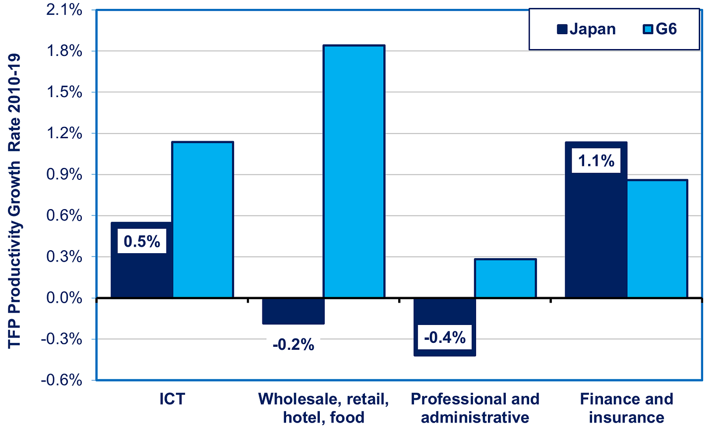 Japan’s services productivity need not have performed so badly. In fact, except for Finance and Insurance, Japan performs substantially worse than the other Group of Seven countries in TFP productivity growth in services. Even negative in some substantial segments (see chart below). Hence, as Japan becomes more of a service economy, overall productivity suffers.