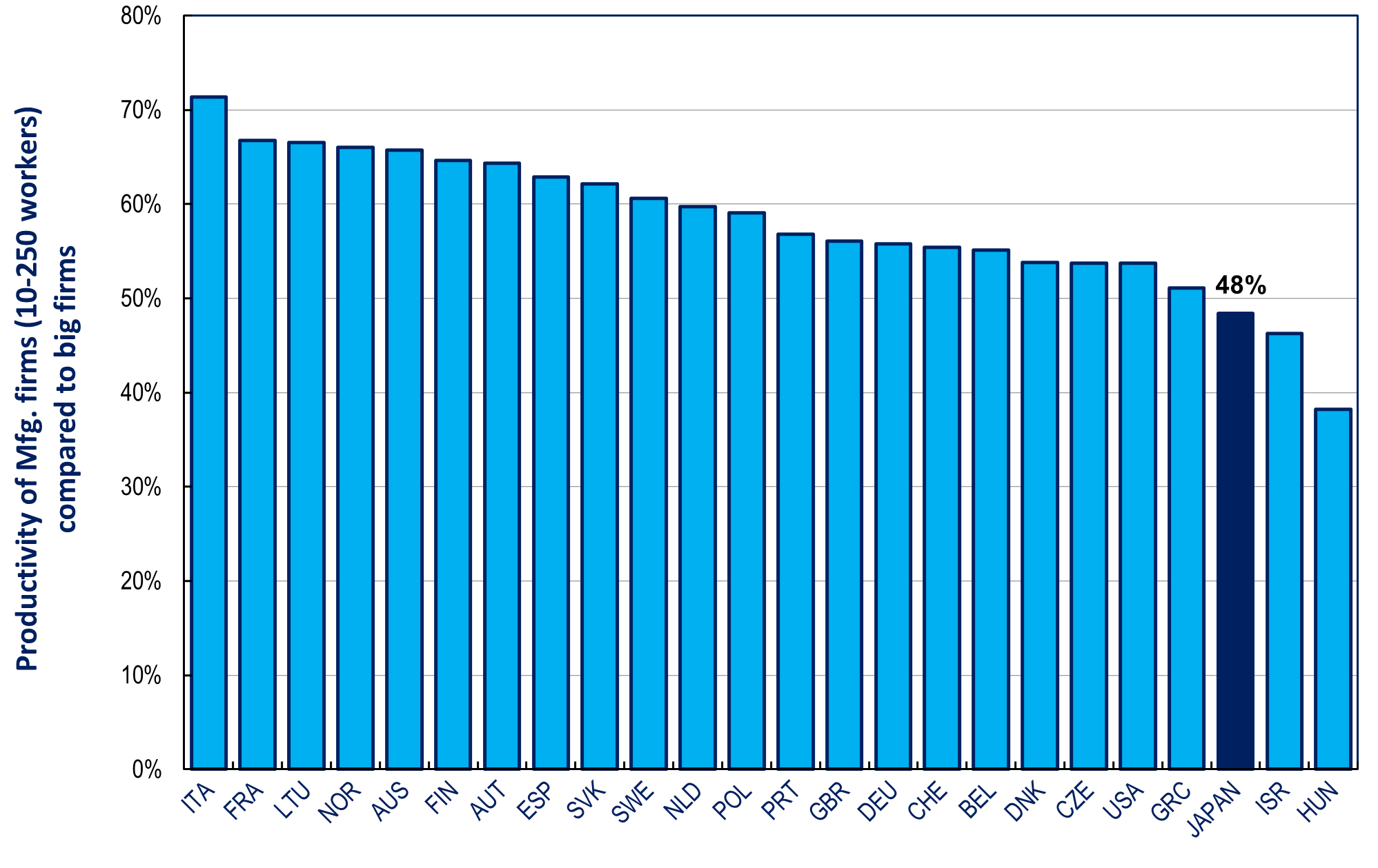 That technological lag is another reason it’s so hard for productivity in Japan to catch up to the NFs. In Japan, the productivity ratio for companies with 10 to 250 employees compared to those with at least 250 employees is the third lowest among 21 countries (see chart below). It’s also the third lowest among companies with 50-249 employees. Since a third of employees work for firms in the 10-249 range and even more at those with fewer than ten, no wonder it’s so hard to diffuse technology and productivity throughout the economy.