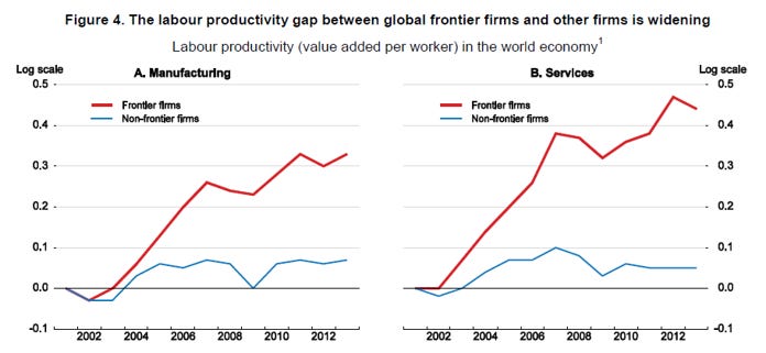 In the last few decades, the world has moved to a “winner take all” economy when it comes to productivity growth. In the past, by contrast, the gap between frontier companies and the average firm was a positive leading indicator of growth in per capita GDP. The bigger the gap—i.e., the more that leading companies advanced the technological frontier—the faster the diffusion of that technology would improve productivity in the average companies. Since the frontier is a moving target, this never-ending catch-up process fueled growth via productivity. It is part of why countries like Japan, Korea, and China were able to grow so fast in their catch-up periods.