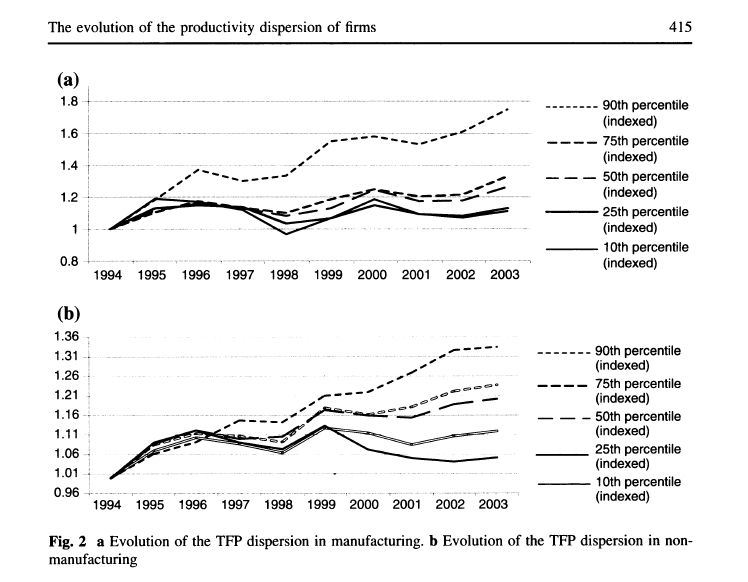 The typical Japanese company fared particularly badly during 1994 to 2003 (I’ve not found more recent data). The top 10% of Japanese manufacturers, 14,000 corporations, enjoyed an 80% hike in TFP productivity. At the typical manufacturer, TFP rose just 30%, and in the bottom 25%, just 10%. In non-financial services, the top 10%—74,000 corporations—increased productivity by 30%, far less than in manufacturing. Firms around the median saw a 20% hike, and the lower tenth, a meager 5% improvement (see chart below). (This does not include all the unincorporated tiny firms with even lower productivity.)