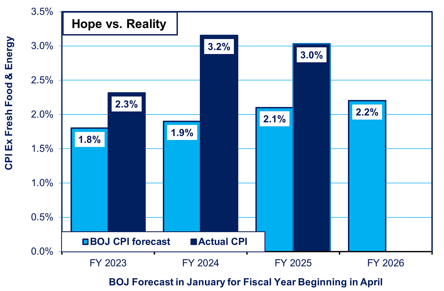 One final note. The BOJ keeps saying it expects consumer inflation to settle at its 2% target within one or two years at most, and it keeps saying it’s getting close to the target. But as far as we can tell, the BOJ feels obliged to put out this forecast lest it appear to be telling the market that its policy is failing. Every January for the past four years, it has predicted that inflation excluding fresh food and energy would be around 2% in the fiscal year beginning three months later in April. Not once has the actual result come close. It has made the same forecast this year, and we’ll see what happens (see the chart at the top). But its forecast should be seen more as hope than expectation.