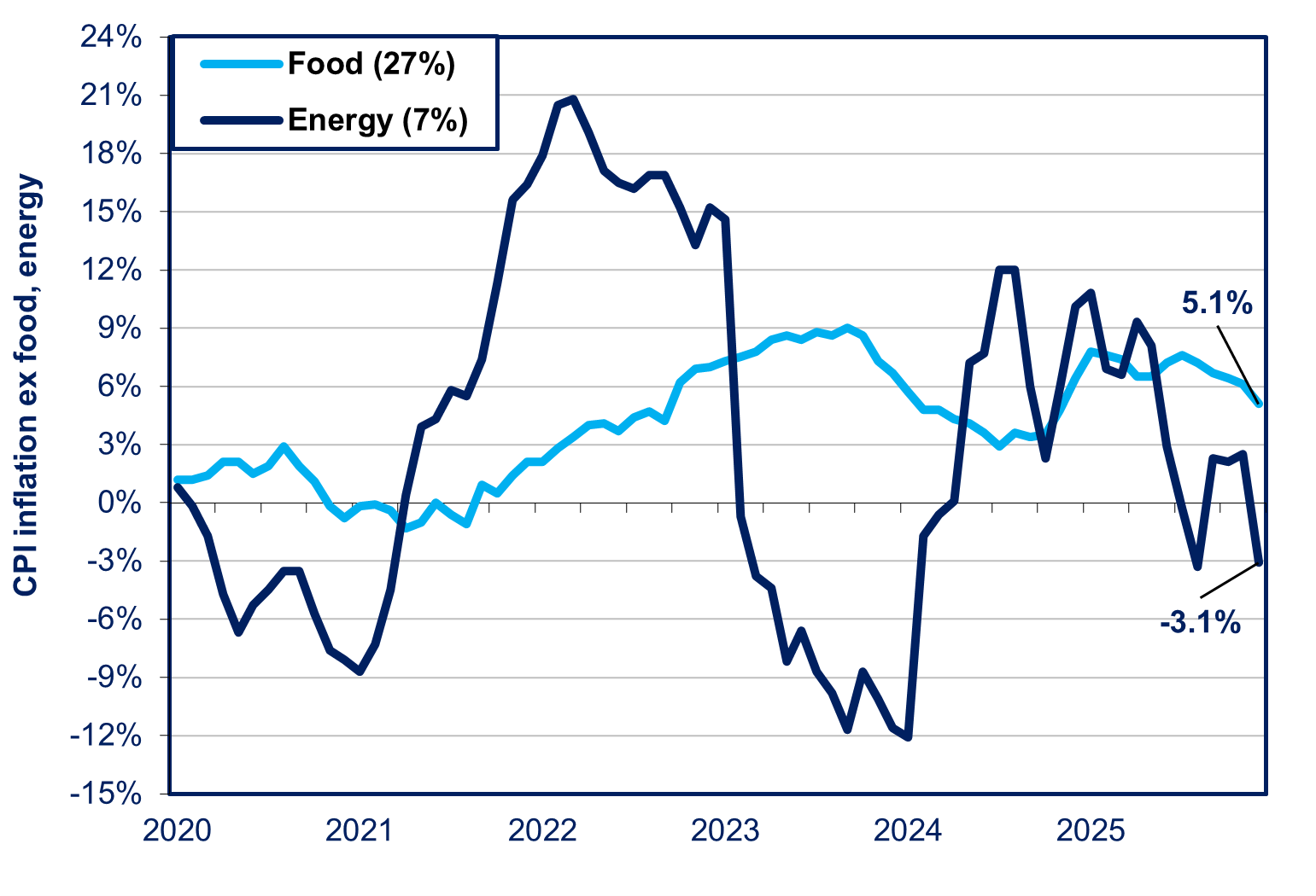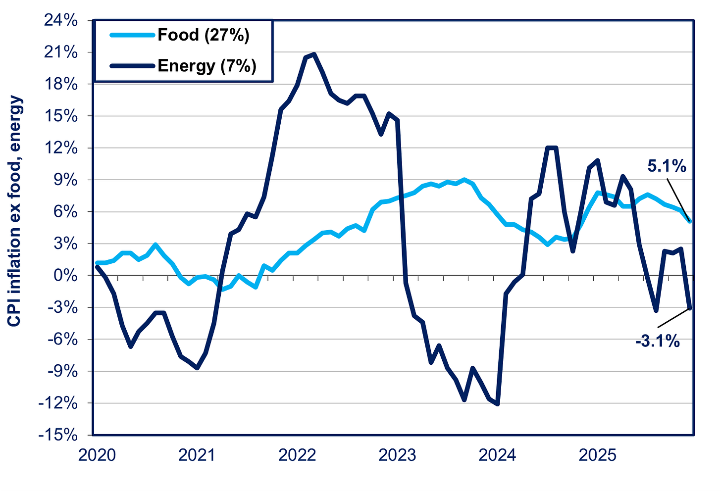 On the one hand, there has been a continued decrease in “bad inflation,” i.e., the unhealthy price shock afflicting the economy via price hikes in import-intensive food and energy (see the first of the two charts below). In December, the price of food, which comprises 27% of people’s budgets, rose 5.1% from the year before, while energy prices fell 3.1% (see the second of these two charts below). The symbolically and politically important rice inflation was 31% in December. It is regarded as “bad inflation” because it amounts to a transfer of wealth to foreign countries. It hurts growth by reducing real wages and raising costs for small- and medium-sized enterprises. It is determined by both global prices and the yen’s purchasing power. Food and energy accounted for 68% of the entire increase in prices over the past two years, and 74% over the past five years.