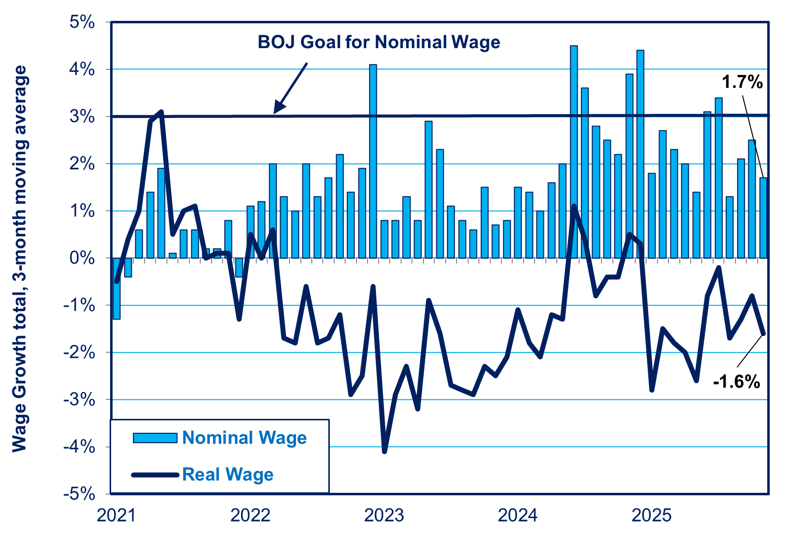 For the past decade, the BOJ has been saying that nominal wages need to rise 3% a year in order to produce 2% inflation led by private domestic demand. However, as of November, nominal wages remain far below 3% and real wages keep falling in the face of inflation (see chart below). That has suppressed the real consumer demand necessary for healthy inflation.
