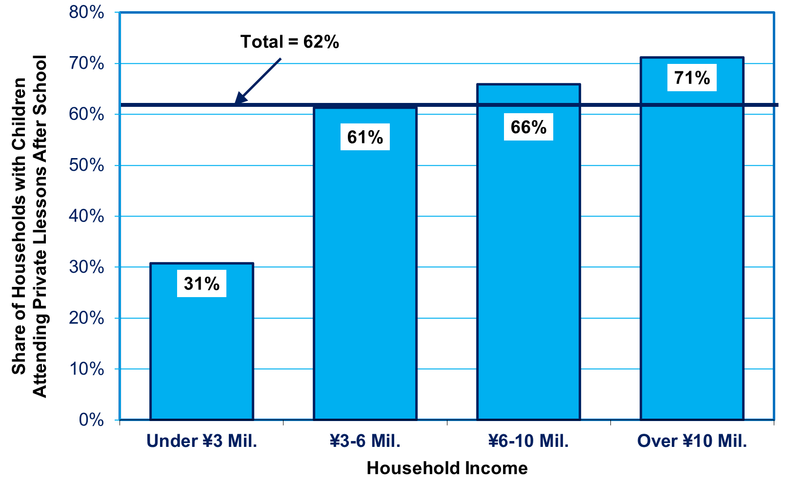 While all parents would like to give their children this advantage, not all can. As with college attendance itself, the share of households investing in private lessons is a function of income. Among those earning under ¥3 million per year, just 31% can invest in private lessons, a share that rises to 66% among in the ¥6-10 million ($60-100,000 PPP) bracket (see chart below).