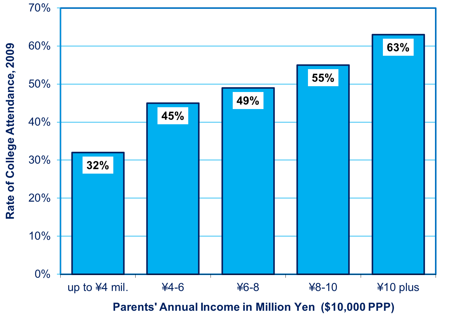 Far more than in the past, income inequality has become a source of education inequality. Only 32% of children in families with less than ¥4 million ($40,000 in Purchasing Power Parity dollars) attend college. By contrast, 45% of those at the ¥4-6 million range, and 55% in the ¥8-10 million range do so (see chart at the top).