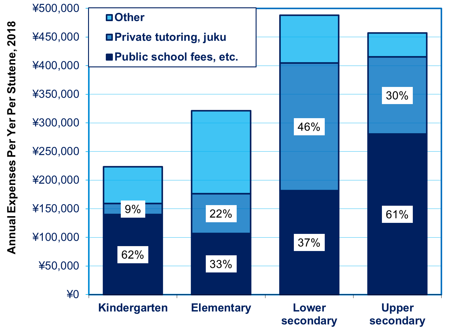 Tuition accounts for only 43% of the ¥5 million ($50,000 PPP) that the family has to pay toward the cost of public school from kindergarten through high school. There are all sorts of fees and expenses, from uniforms to computers to assorted activities. And then there are the long hours of costly after-school private lessons needed for the entrance exams that determine where one goes to junior high, then high school, and whether one even gets into a university. Altogether, in 2018, the average family paid more than ¥300,000 ($3,000 PPP) per year for primary school and ¥400-to-500,000 ($5,000 PPP) for middle school and high school (see chart below).